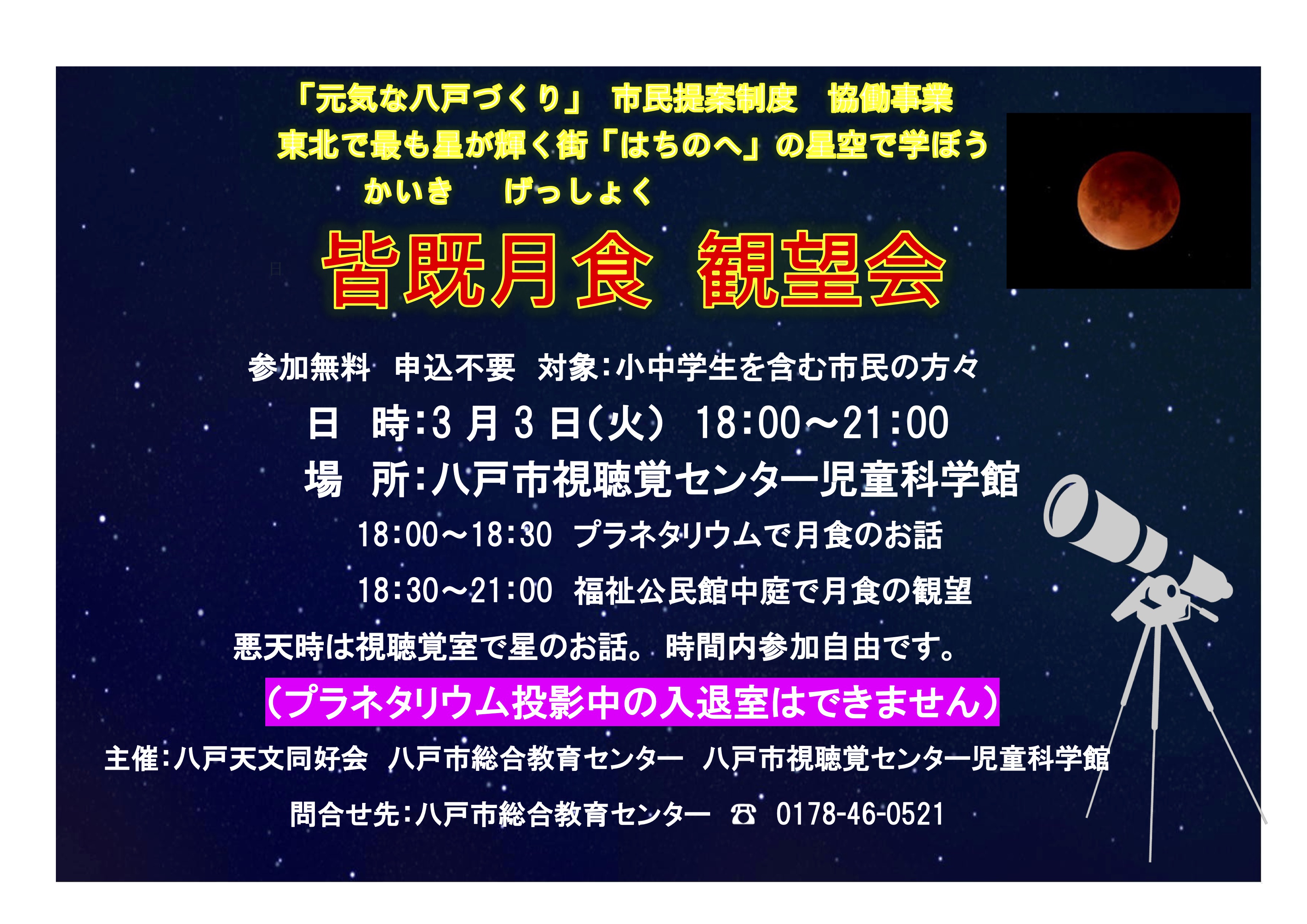 ・18:30~21:00 福祉公民館中庭で月食の観測 - 参加費